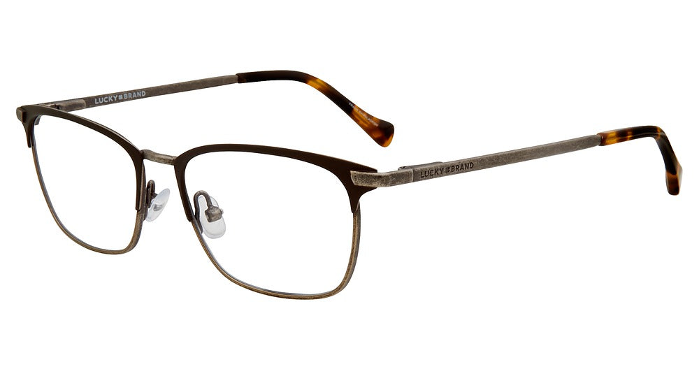 Lucky Brand eyeglasses D812 by De Rigo Rem has a handmade Metal designer frame.Most brand name designer frames come with an authentic case. This frame is beautifully crafted for male. This specially designed eyeglass frame shape is a Modified Oval and features a Full Rim construction. The bridge is universal, which should allow a comfortable fit on a person with a shallow bridge on their nose. The temples are skull designed, therefore, they wrap over your ears.