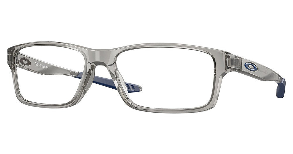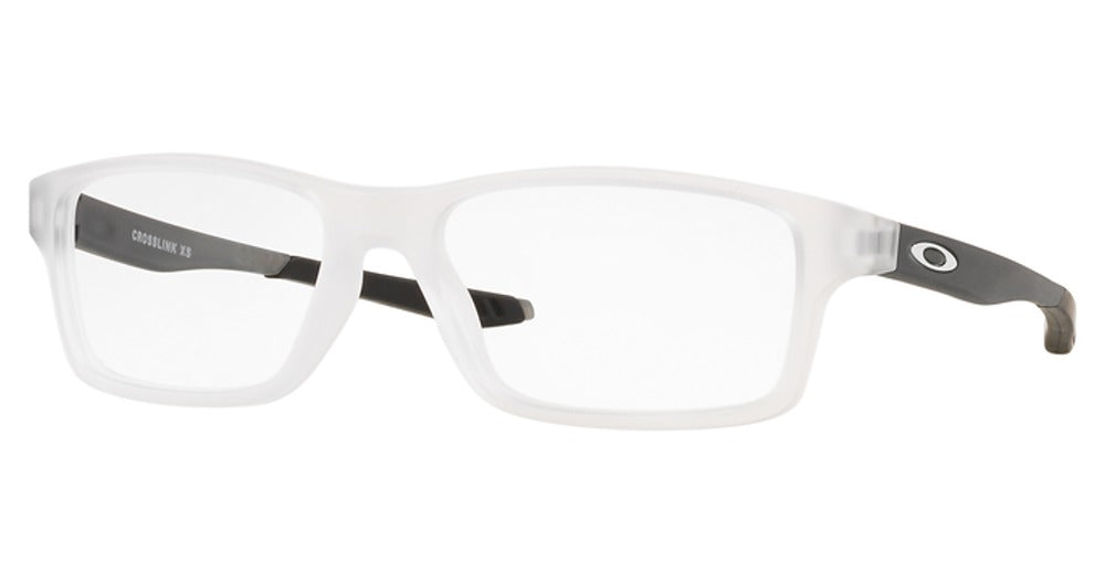 Oakley Youth eyeglasses OY8002 CROSSLINK XS by Luxottica has a handmade Nylon designer frame.Most brand name designer frames come with an authentic case. This frame is beautifully crafted for male. This specially designed eyeglass frame shape is a Rectangle and features a Full Rim construction. The bridge is universal, which should allow a comfortable fit on a person with a shallow bridge on their nose. The temples are straight designed, therefore, they wrap over your ears.