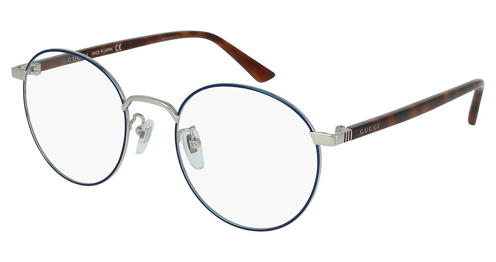 Gucci eyeglasses GG0297OK by Kering Eyewear has a handmade Metal METAL designer frame.Most brand name designer frames come with an authentic case. This frame is beautifully crafted for unisex. This specially designed eyeglass frame shape is a Round and features a Full Rim construction. The bridge is universal, which should allow a comfortable fit on a person with a shallow bridge on their nose. The temples are skull designed, therefore, they wrap over your ears.
