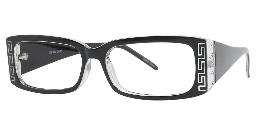 4U eyeglasses US68 by Capri Optics has a handmade Plastic designer frame.Most brand name designer frames come with an authentic case. This frame is beautifully crafted for female. This specially designed eyeglass frame shape is a Rectangle and features a Full Rim construction. The bridge is universal, which should allow a comfortable fit on a person with a shallow bridge on their nose. The temples are skull designed, therefore, they wrap over your ears.