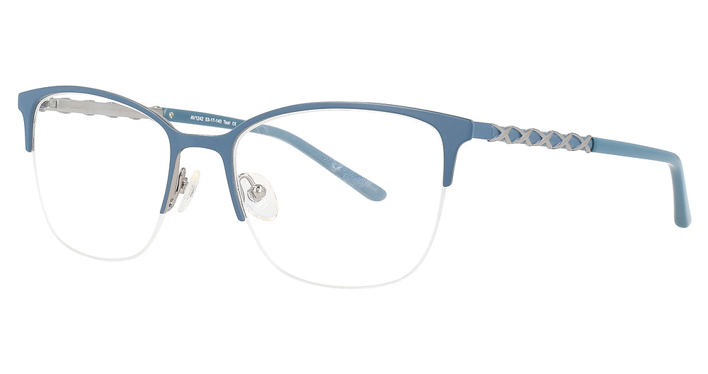 Free shipping on all orders over $99 and save up to 50% off retail shop pricing on Adrienne Vittadini eyeglasses AV1242 by Match Eyewear has a handmade Metal designer frame. Most brand name designer frames come with an authentic case. This frame is beautifully crafted for female. This specially designed eyeglass frame shape is a Modified Round and features a Semi-Rimless construction. The bridge is universal, which should allow a comfortable fit on a person with a shallow bridge on their nose. The temples are skull designed, therefore, they wrap over your ears. The Adrienne Vittadini eyeglasses AV1242 has a one-year warranty, which means if there is a manufacturing defect due to workmanship, they may be exchanged at no charge. Please call or email us so we can help you return the frame to the manufacturer. The frame size and color that is available for this model is Teal and size(s) of Eye size: 53mm, Bridge size: 18mm, Temple length: 140mm.