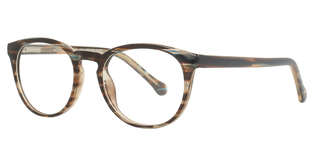 Advantage eyeglasses Max by ClearVision has a handmade Plastic designer frame.Most brand name designer frames come with an authentic case. This frame is beautifully crafted for male. This specially designed eyeglass frame shape is a Modified Round and features a Full Rim construction. The bridge is universal, which should allow a comfortable fit on a person with a shallow bridge on their nose. The temples are skull designed, therefore, they wrap over your ears.