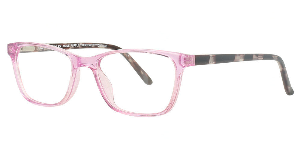 Advantage eyeglasses Move by ClearVision has a handmade Plastic designer frame.Most brand name designer frames come with an authentic case. This frame is beautifully crafted for female. This specially designed eyeglass frame shape is a Cat Eye and features a Full Rim construction. The bridge is universal, which should allow a comfortable fit on a person with a shallow bridge on their nose. The temples are skull designed, therefore, they wrap over your ears.