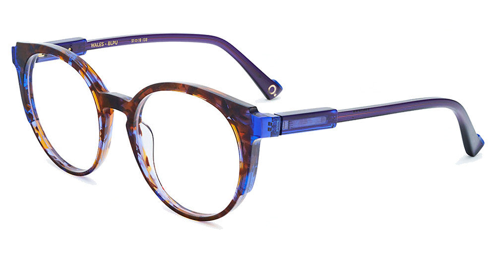 Etnia Barcelona eyeglasses 5 WALES 51O by Etnia Eyewear Culture has a handmade Plastic designer frame.Most brand name designer frames come with an authentic case. This frame is beautifully crafted for female. This specially designed eyeglass frame shape is a Round and features a Full Rim construction. The bridge is universal, which should allow a comfortable fit on a person with a shallow bridge on their nose. The temples are skull designed, therefore, they wrap over your ears.