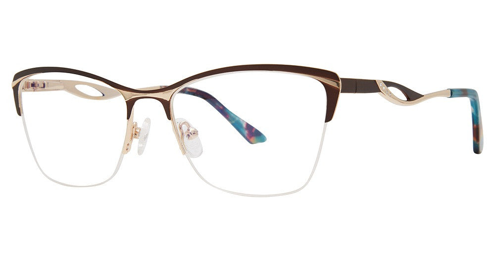Genevieve Paris Design eyeglasses Belinda by Modern Optical has a handmade Metal french comotech spring hinge, handmade zyl temple tips, multifaceted gemstones, nylon rimless, silicone pads, stainless steel designer frame.Most brand name designer frames come with an authentic case. This frame is beautifully crafted for female. This specially designed eyeglass frame shape is a Cat Eye and features a Half Rim construction. The bridge is universal, which should allow a comfortable fit on a person with a shallow bridge on their nose. The temples are skull designed, therefore, they wrap over your ears.