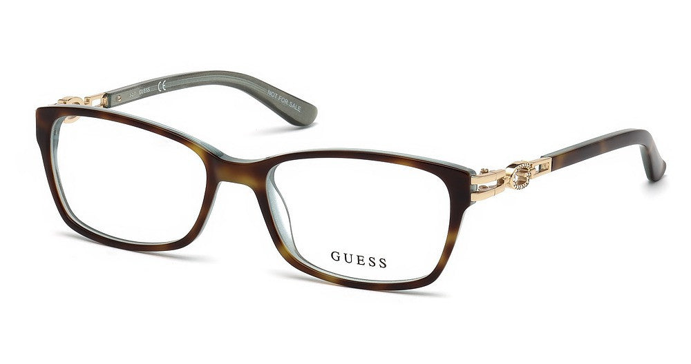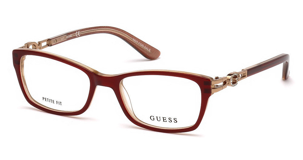 Guess? eyeglasses GU2677 by Marcolin® has a handmade Plastic designer frame.Most brand name designer frames come with an authentic case. This frame is beautifully crafted for female. This specially designed eyeglass frame shape is a Geometric and features a Full Rim construction. The bridge is universal, which should allow a comfortable fit on a person with a shallow bridge on their nose. The temples are skull designed, therefore, they wrap over your ears.
