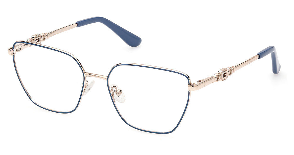 Guess? eyeglasses GU2952 by Marcolin® has a handmade Metal designer frame.Most brand name designer frames come with an authentic case. This frame is beautifully crafted for female. This specially designed eyeglass frame shape is a Geometric and features a Full Rim construction. The bridge is universal, which should allow a comfortable fit on a person with a shallow bridge on their nose. The temples are skull designed, therefore, they wrap over your ears.