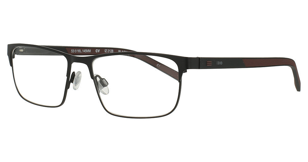 Izod eyeglasses 2128 by ClearVision has a handmade Metal designer frame.Most brand name designer frames come with an authentic case. This frame is beautifully crafted for male. This specially designed eyeglass frame shape is a Rectangle and features a Full Rim construction. The bridge is universal, which should allow a comfortable fit on a person with a shallow bridge on their nose. The temples are skull designed, therefore, they wrap over your ears.