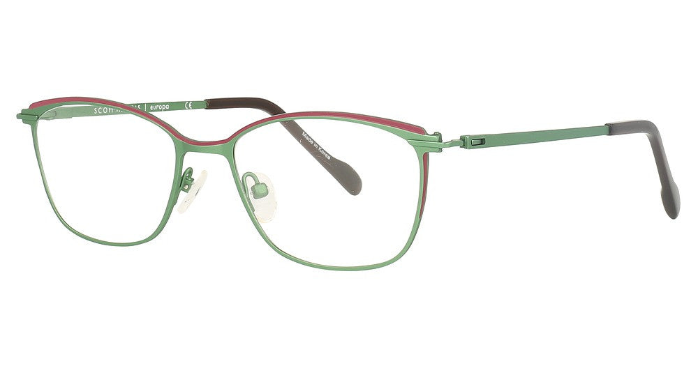 Scott Harris eyeglasses Scott Harris 824 by Europa Eyewear has a handmade Metal Stainless Steel designer frame.Most brand name designer frames come with an authentic case. This frame is beautifully crafted for female. This specially designed eyeglass frame shape is a Modified Oval and features a Full Rim construction. The bridge is universal, which should allow a comfortable fit on a person with a shallow bridge on their nose. The temples are skull designed, therefore, they wrap over your ears.